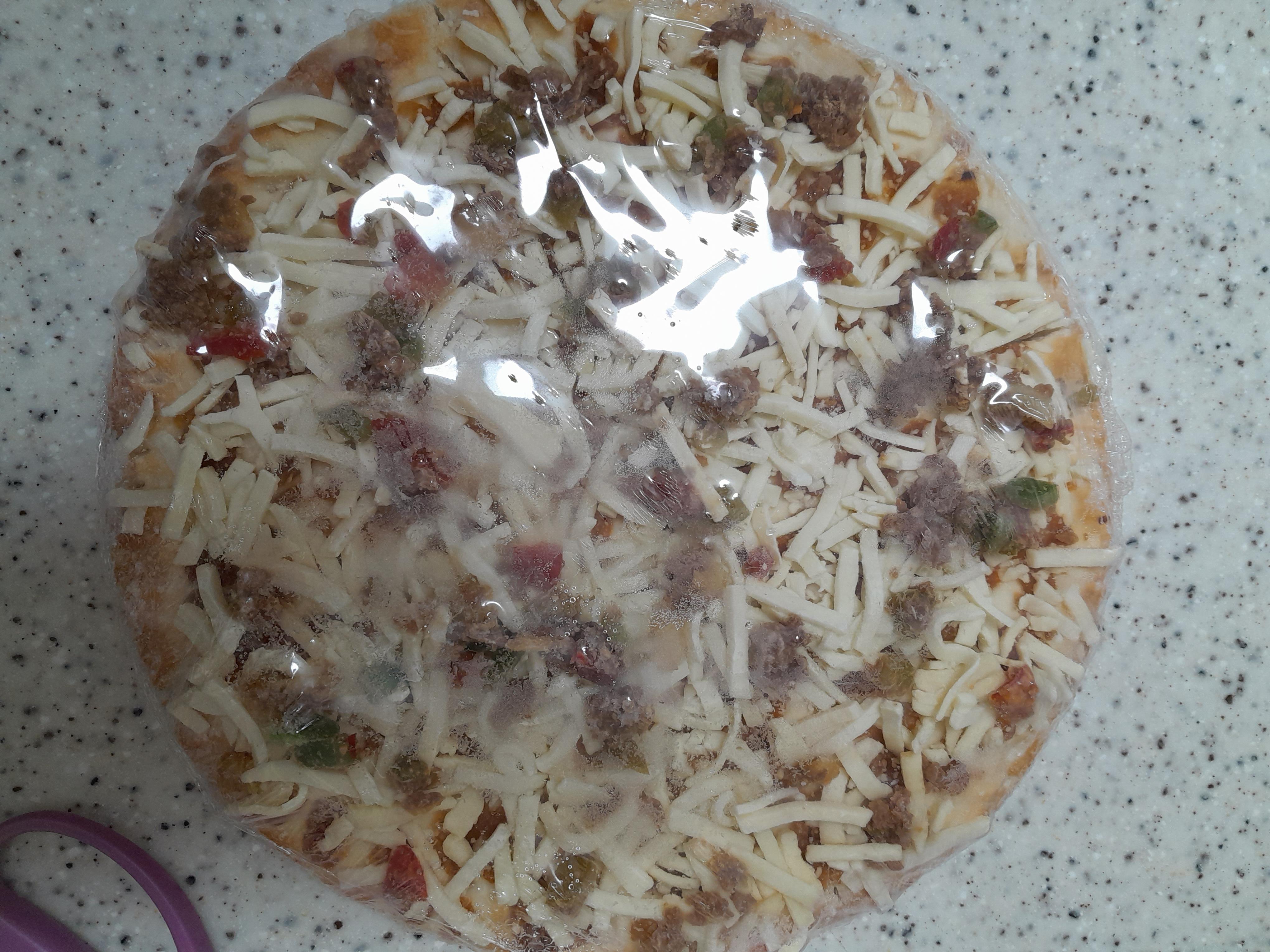 해동하지 않은 냉동상태의 피자를 감싸고 있는 비닐을 제거해줍니다.