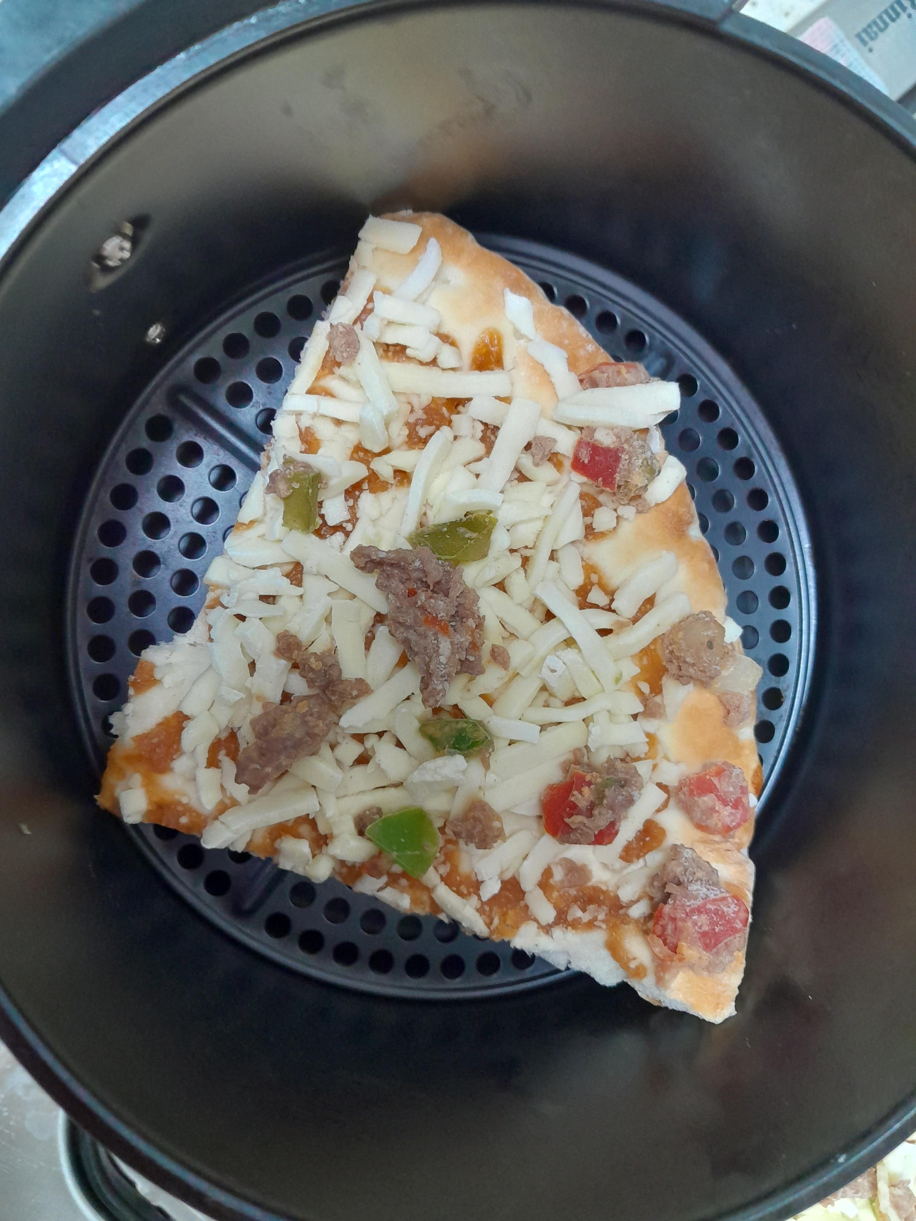 에어프라이어는 피자 한판이 통째로 들어가는 경우가 거의 없어서 쪼개서 조리해야 합니다.